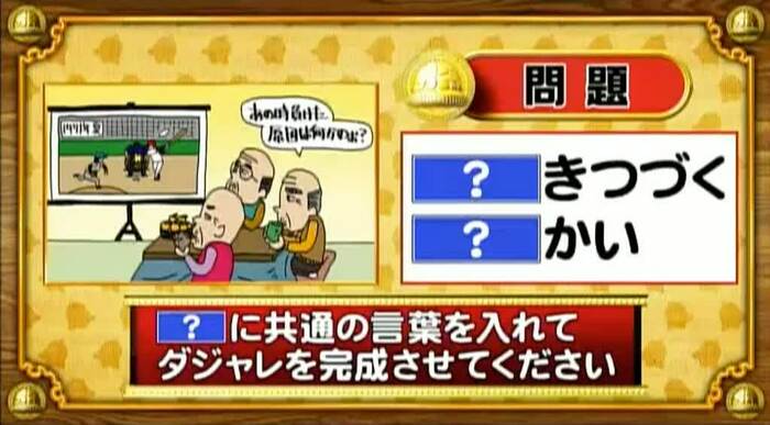 次は、ダジャレ穴埋めの問題。「?」に共通する言葉を入れてダジャレを完成させよ。