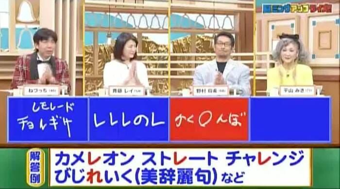 正解は「カメレオン」「ストレート」「チャレンジ」「びじれいく(美辞麗句)」など。野村1人が見事正解!