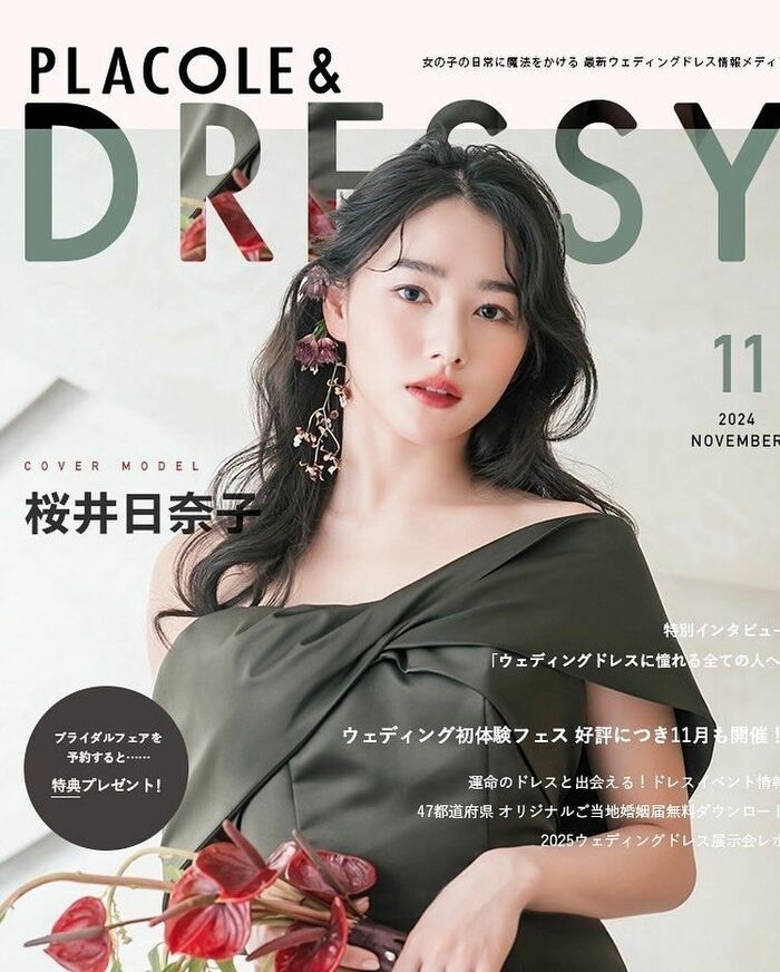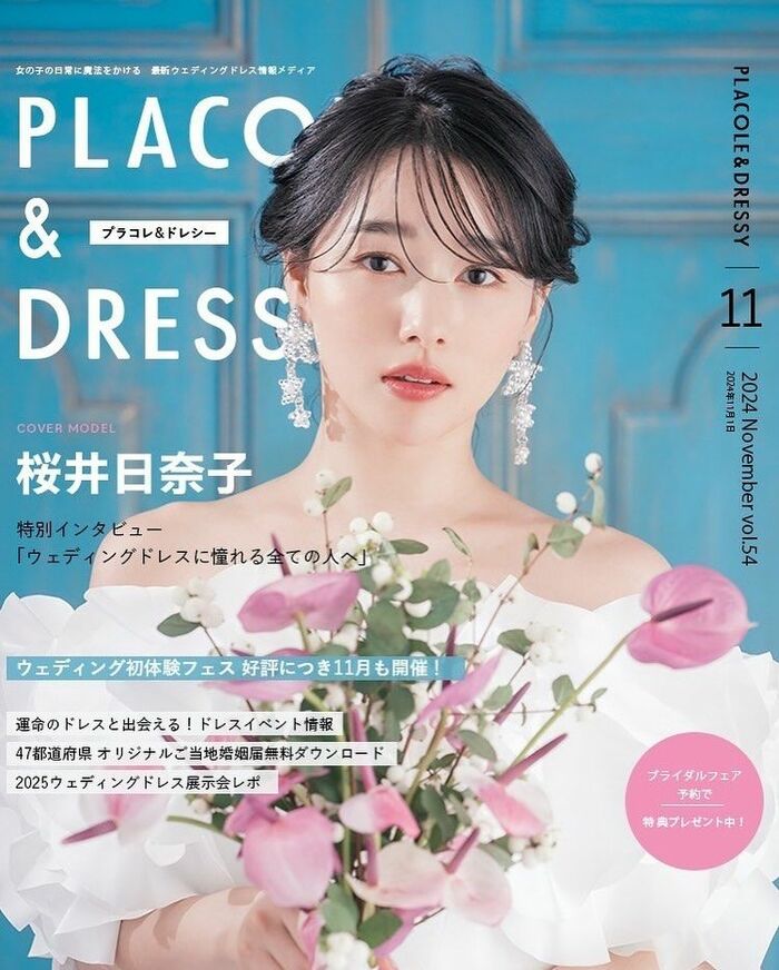 女優の桜井日奈子さんが2024年11月1日に自身のインスタグラムを更新。ウェディングドレスを中心に最先端で価値あるものを発信するファッションメディア「PLACOLE&DRESSY(プラコレ&ドレシー)」の2024年11月号の表紙を務め、ウェディングドレス姿を披露しました。