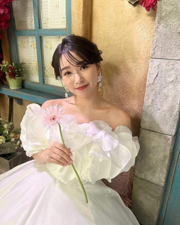 表紙のカットを見ると、花束を持ち、まとめ髪ヘアで真っ白なウェディングドレス姿に。投稿では、そのドレスのオフショットをアップしており…