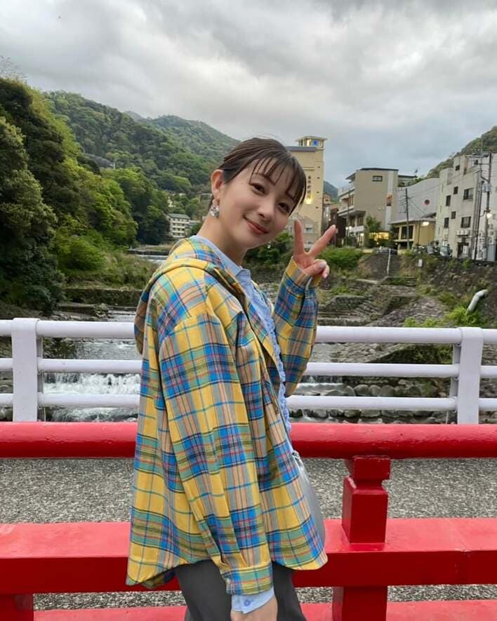 箱根湯本の赤い橋の前でピースを決める足立さんは、髪を1つにまとめ、黄色ベースに水色のチャック柄のシャツを羽織っています。