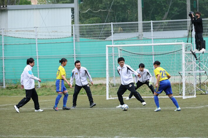 最初の対決は、一昨年のインターハイでベスト8に入った茨城県・鹿島学園高等学校女子サッカー部。試合は芸人チーム7人に対し、強豪校チームは4人で行うほか、強豪校側のゴールはフットサル用よりも大きいサッカー用のゴールを使用するなど厳しいハンデが。