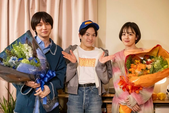 最後のカットで監督からOKが出ると、緊張感が漂っていた現場は一転、盛大な拍手と大きな歓声に包まれました。するとそこへ、すでにクランクアップしていた松倉海斗さんが花束を抱えて登場。予期せぬサプライズに、2人は驚きつつもうれしそうな表情を見せました。