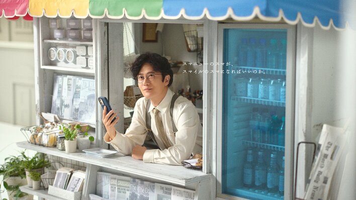 新CMは街角に佇む小さなニューススタンドが舞台。店主に扮した稲垣さんが、そこを訪れるさまざまな人たちとのやりとりを通し、「スマイルニュース」を届けようとする理由が少しずつ明らかになっていきます。