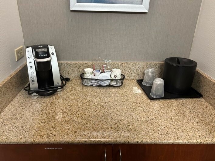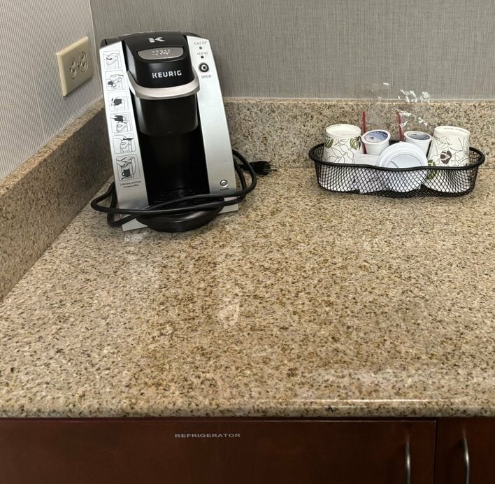 大理石調デザインのスペースの左側には、コーヒーマシンや紙コップ、飲み口がついたフタ、マドラーのようなものが。