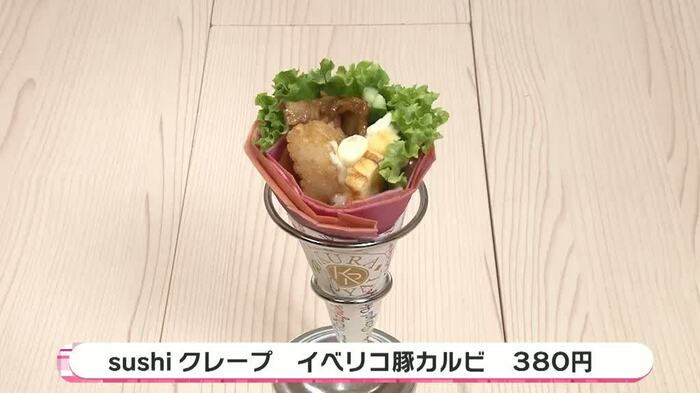 寿司店の中にスイーツ屋台コーナーもあり、なんと「sushiクレープ」を販売。目の前で自動クレープ焼きロボットがクレープを作ってくれる。ピンクとイエローのクレープ生地にクリームチーズを乗せ、シャリを素揚げして作った揚げシャリとイベリコ豚を巻いた「sushiクレープ イベリコ豚カルビ」は写真映えすること間違いなし!