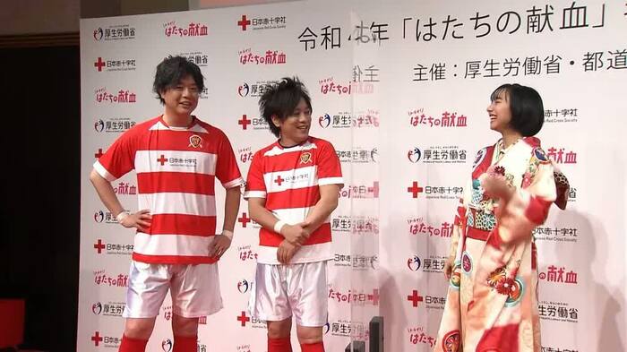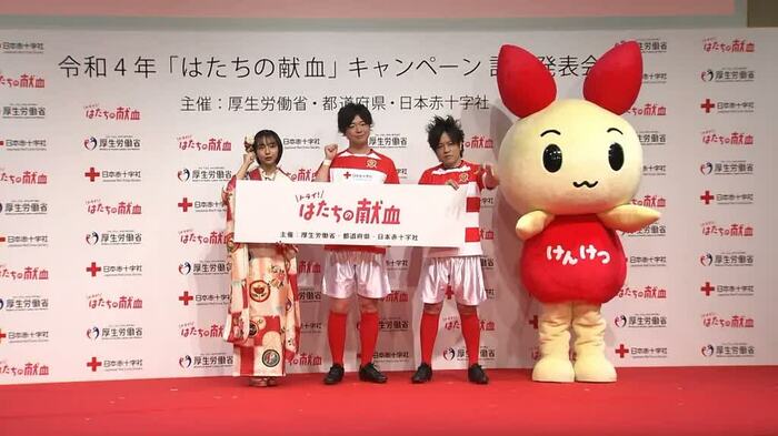 お笑い芸人のぺこぱ(シュウペイ、松陰寺太勇)とタレント・女優の山之内すずがキャンペーンキャラクターを務める、令和4年「はたちの献血」キャンペーン記者発表会が、1月6日(木)に行われ、ぺこぱと山之内が出席した。