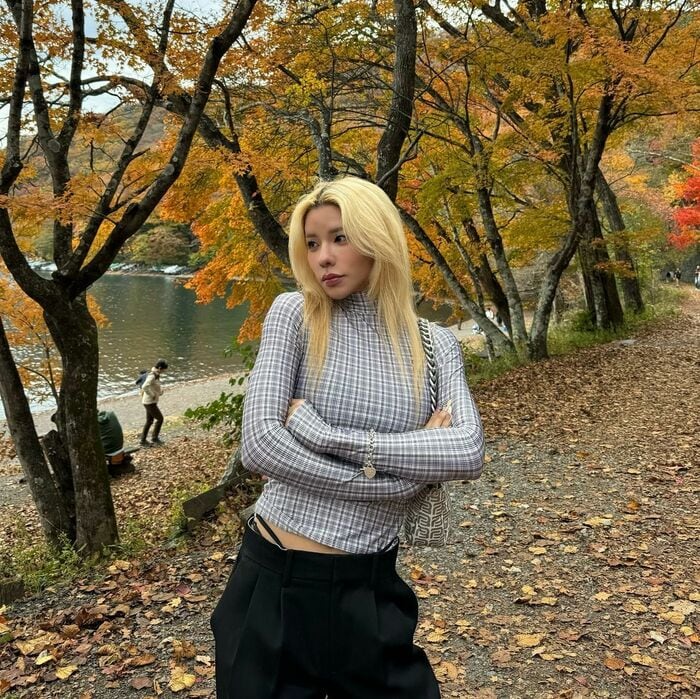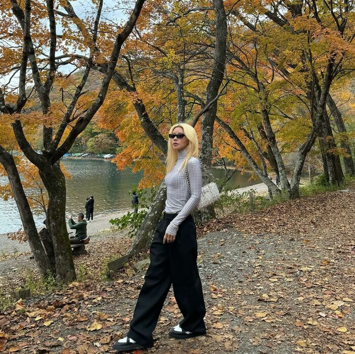 ボディーラインが際立つタートルネックに、太めの黒いボトムス、さらにサングラスをかけたクールな装いが目を引きますが、その背景を見てみると、中町さんと同じく美しい紅葉が!