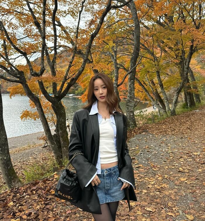黒いジャケットにミニのデニムスカート、薄手のタイツという秋らしいコーディネートが背景の紅葉に映えています。