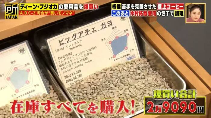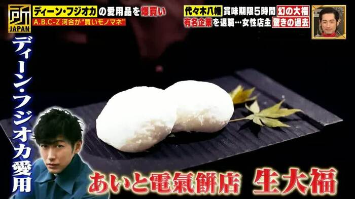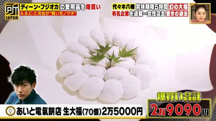 この大福をディーンは差し入れで、ここぞという時に購入すると言い、河合もそれにならい番組スタッフを含めてた70個の大福を爆買いした。