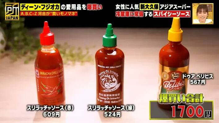 ディーンは、タイ発祥の辛さの中に酸味・コク・旨味がある“スリラッチャソース”(緑)を手に取り、「ピリッとくるけど、肉とかをつけて食べるとおいしい」とオススメ。世界各国でさまざまな調味料を食べてきたディーンがとくに気に入っているソースだそう。