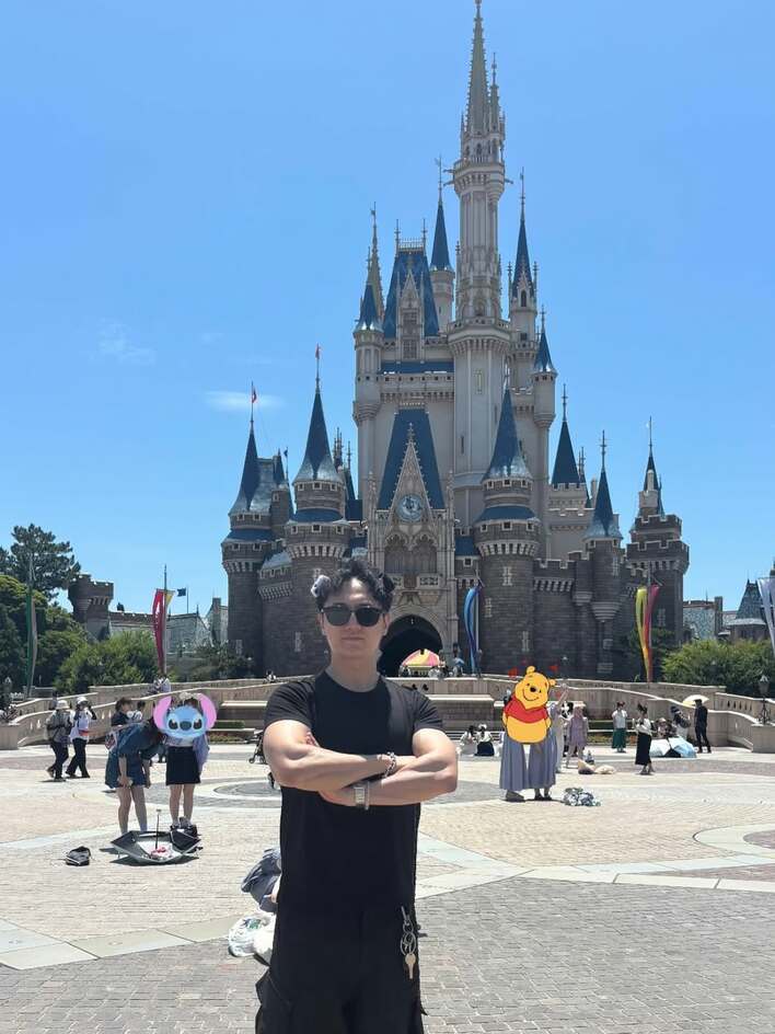シンデレラ城の前では、口を真一文字に結び、真剣な表情で腕を組みカメラを見つめています。その前腕にはくっきりと筋が入っていて、筋骨隆々としているのが分かりますね。