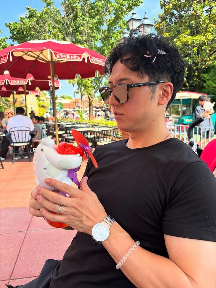 ぴっちりとした黒いTシャツ姿でサングラスをかけた西野さんは、ベイマックスのミストファンを持ち、日陰で暑さをしのいでいる様子。頭にはディズニーのキャラクターのヘアピンをつけていて、夢の国を満喫しているようです。