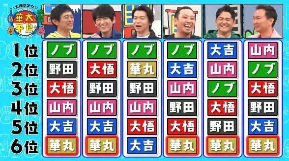 恒例の山内による”華丸下げ”が始まったため、みなで華丸をフォローする流れになったが、ほとんどの人が華丸を6位に予想していた。ということで、華丸は黙って6位の予想席へ。