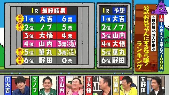 野田は「(自分は)ネタのイメージが強いと思う」と言い、大悟は自ら「アイドルの子が『大悟さんがお兄ちゃん』っていうのに得ないもん」ということで、上位ではないと予想。