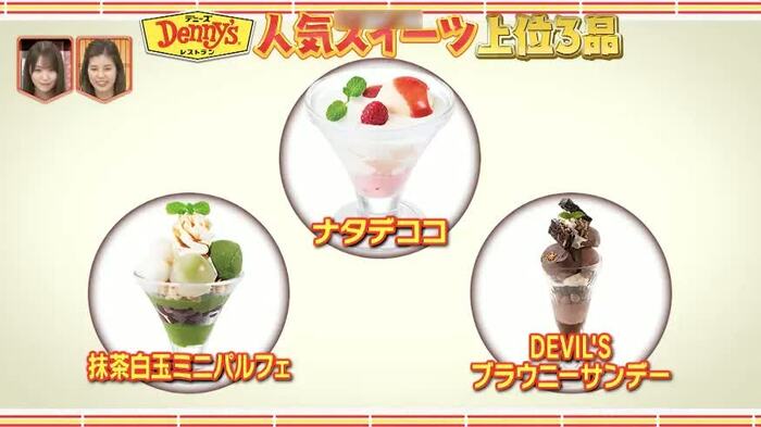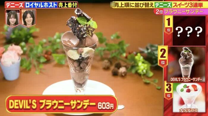 3位はデニーズがファミレスの中で日本で初めて販売した「ナタデココ」が、2位はチョコアイスにココアコーン、チョコプリンにブラウニーと、チョコ好きのためにさまざまなチョコを入れた「DEVIL’S ブラウニーサンデー」となった。