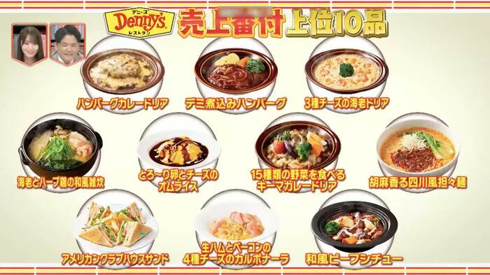 まずは、東日本発「デニーズ」の売上番付を発表。上位10品には、ドリアをはじめとする定番メニューや国際色豊かな商品が並ぶ。