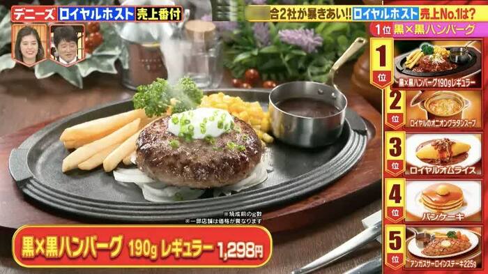 1位は、国産黒毛和牛と国産黒豚を独自の配合で調理した「黒✕黒ハンバーグ190gレギュラー」。