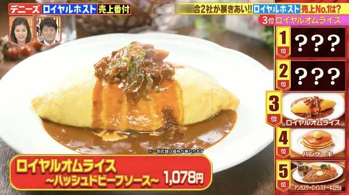 4位はロイヤルホストの定番人気メニュー「パンケーキ」が、3位にはしっかりと硬めに焼き上げた卵が特徴の「ロイヤルオムライス」がランクイン。
