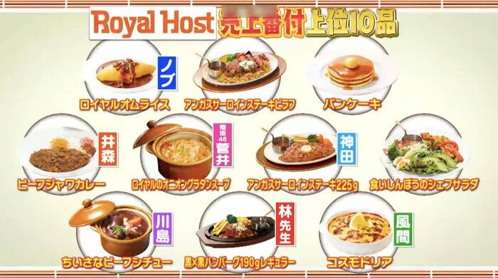 西日本発「ロイヤルホスト」の売上番付。上位10 品には、洋食レストランの定番に、看板メニュー、外食メニューの王様などが並んだ。