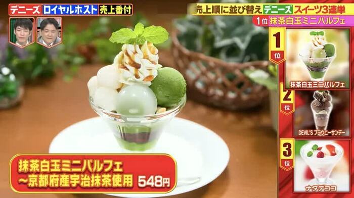 そして1位は、「抹茶白玉ミニパルフェ」。京都府産の一番摘み茶葉のみを使用したデニーズ完全オリジナルの濃い抹茶アイスは、周りのバニラアイスと一緒に食べることで、好きな濃さにすることができるそうだ。