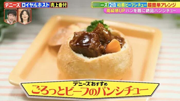 こちらの商品は、持ち帰りできる「おうちデニーズ」にもラインナップ。デニーズ特製石窯ブールの中身をくり抜いて、温めた「和風ビーフシチュー」を入れれば、「ごろっとビーフのパンシチュー」が完成する。