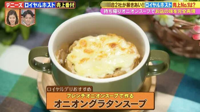 2位の「ロイヤルのオニオングラタンスープ」は、牛ひき肉、セロリ、にんじんなど、たっぷりの具材を2日がかりで煮込んですっきりした味わいのスープを作成。スープの味を際立たせるために先にパンとチーズを温め、香りの強いチーズがスープに溶けてしまうのを防いでいるという。