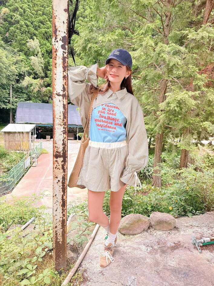 公開された写真を見てみると、水色のTシャツの上にショート丈のストライプシャツを着て、さらに同じ柄のショートパンツを合わせたセットアップコーデでたたずむスザンヌさんの姿が!