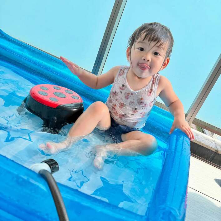 妹・ひーちゃん(2)と一緒に、自宅のベランダでプールを大満喫する姿を公開しました。