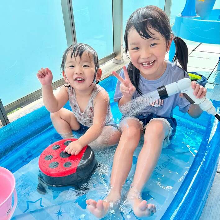 まだまだ水が足りないのか、ののちゃんシャワーホースを持って水をプール中に出し続けていますね。ふたりとも髪の毛まで水にぬれていて、楽しそうに遊んでいます!