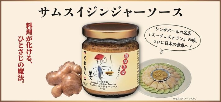 「サムスイ ジンジャーソース」は、シンガポールの人気店「Soup Restaurant(スープレストラン)」発の本格調味料です。年間120万人以上が味わう看板メニュー「サムスイチキン」に添えられる特製ソースを、そのまま日本に直輸入。生姜と香味野菜の風味が際立ち、肉や魚、豆腐、納豆などさまざまな料理に使えます。