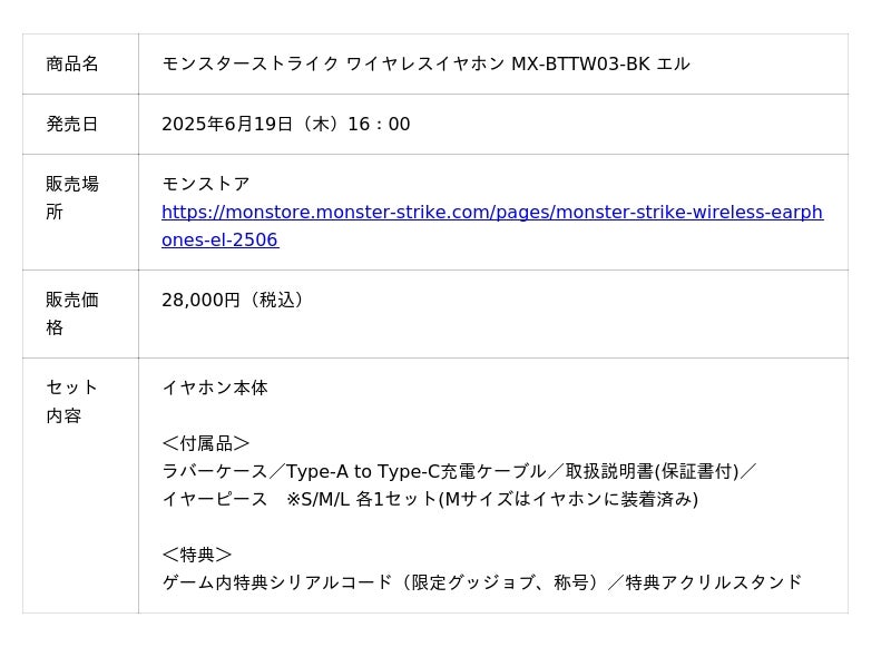 株式会社MIXI(東京都渋谷区、代表取締役社長 上級執行役員 CEO:木村 弘毅)は、スマホアプリのひっぱりハンティングRPG「モンスターストライク」(以下モンスト)に登場するキャラクター「エル」をモチーフにしたワイヤレスイヤホン「モンスターストライク ワイヤレスイヤホン MX-BTTW03-BK エル」(以下エル ワイヤレスイヤホン)を、モンスト公式オンラインストア「モンストア」(https://monstore.monster-strike.com/)にて、6月19日(木)16:00より販売開始します。