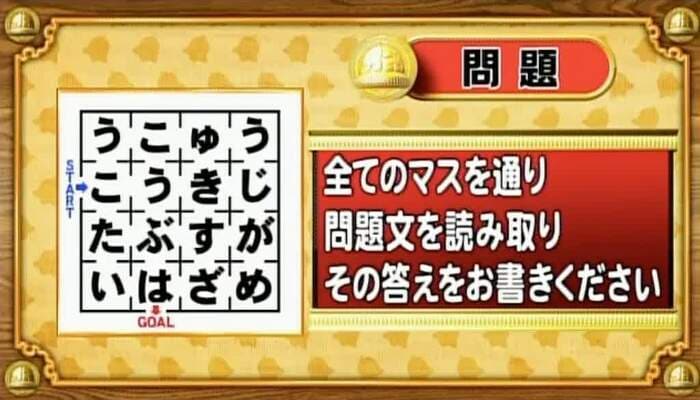 最初は「脳ミングアップクイズ」から、迷路クイズ。すべてのマスを通って読み取ることが出来る問題文の答えはなんでしょうか?