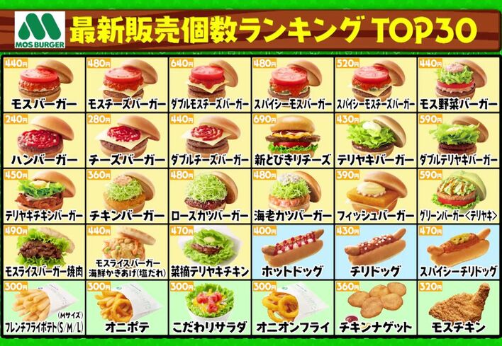 今回は「モスバーガー」の人気メニュー30品の中から、“最新販売個数ランキング”を、順位が下位から上位へとカウントダウンするように予想しました。