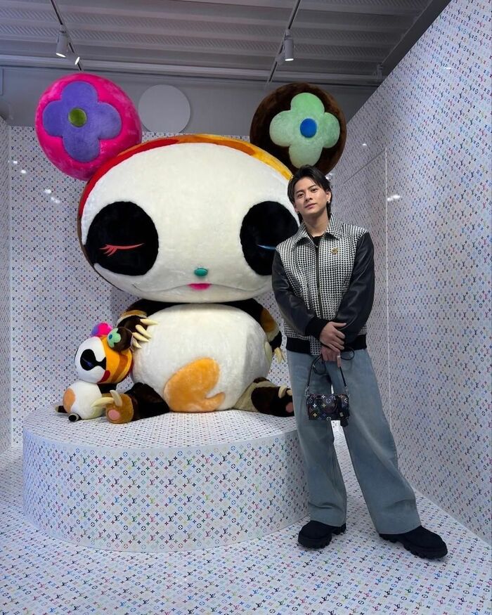 ルイ・ヴィトンのカバンを持ち、シックな装いの平野さんは、キャラクター「スーパーフラット・パンダ」の置物とともにパシャリ!