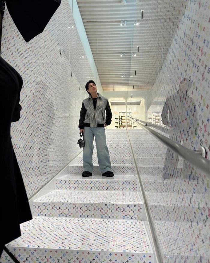 また、壁や階段にルイ・ヴィトンのマークが描かれたエリアでは、腰に手をあて天井を見上げていたり…