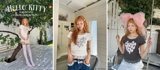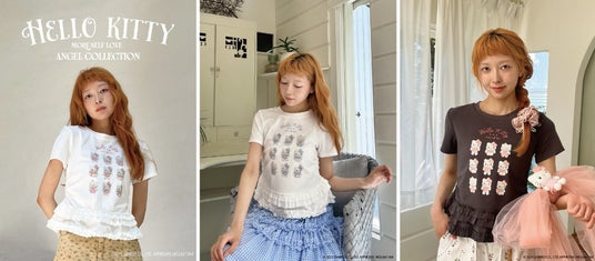 エンジェルに変身したハローキティのぬいぐるみフォトプリントデザインや、ラインストーンで表現されたTシャツが登場。