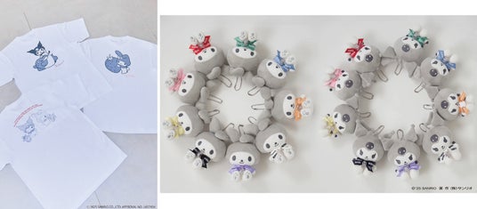 バックプリントを見せたくなるマイメロディやクロミのプリントのTシャツと、モノトーン仕様と9色のROYALPARTYリボンがポイントのぬいぐるみチャーム。