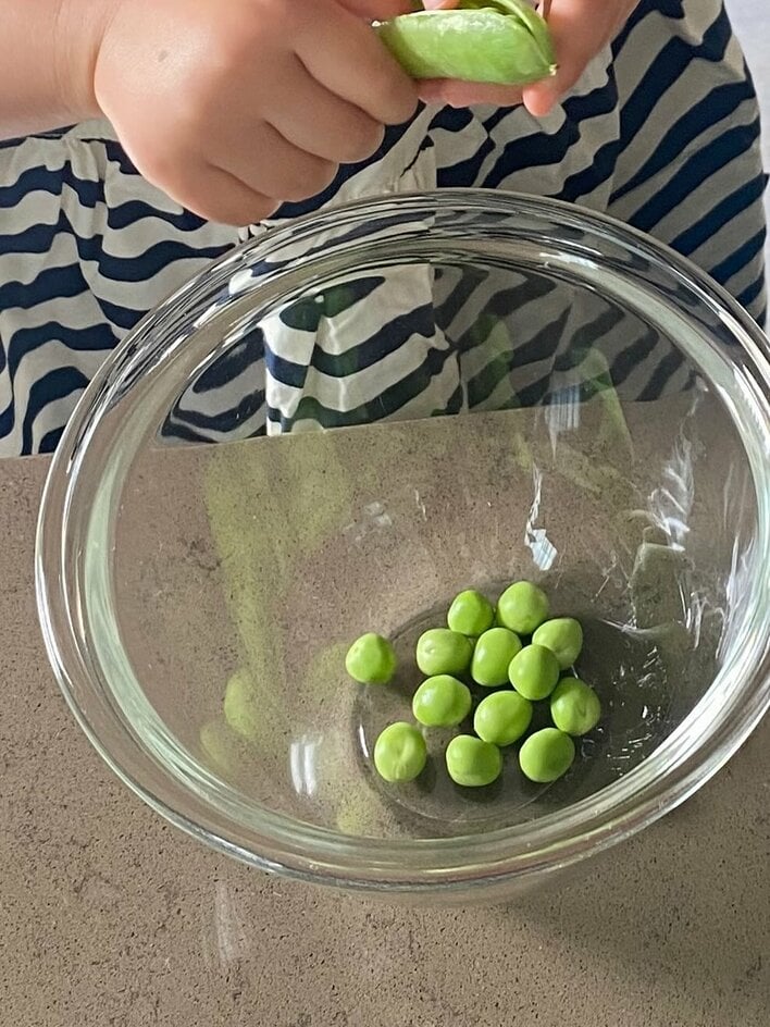 公開された写真には、グリーンピースをさやから取り出してガラスのボウルに移すお手伝いをしている孫の香澄ちゃんの手元が写っています!
