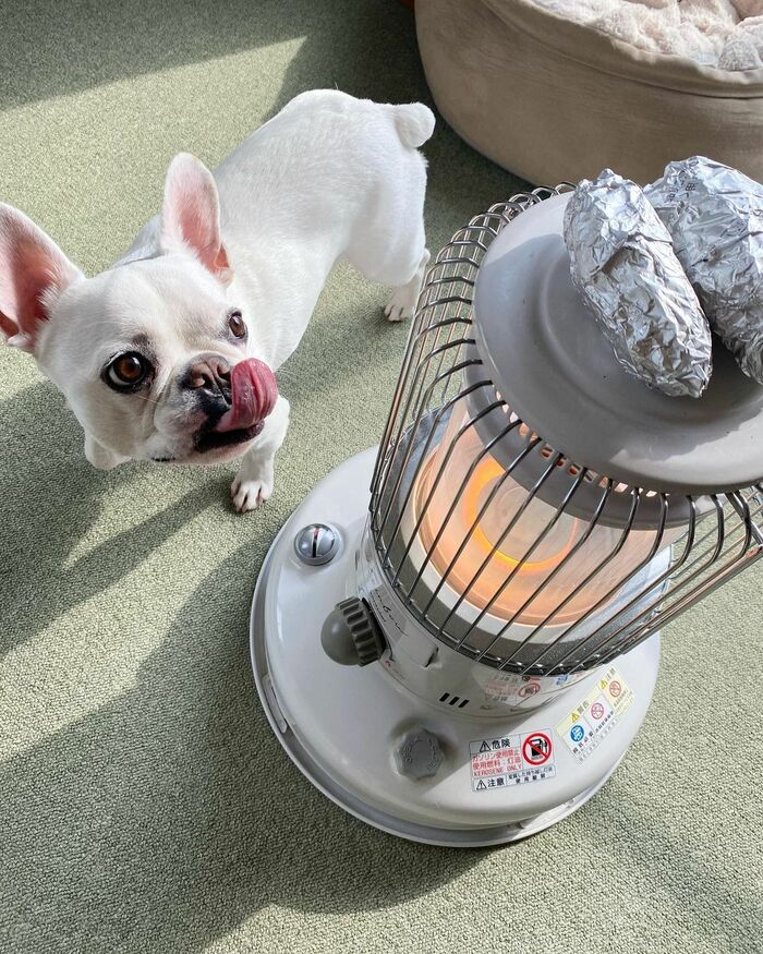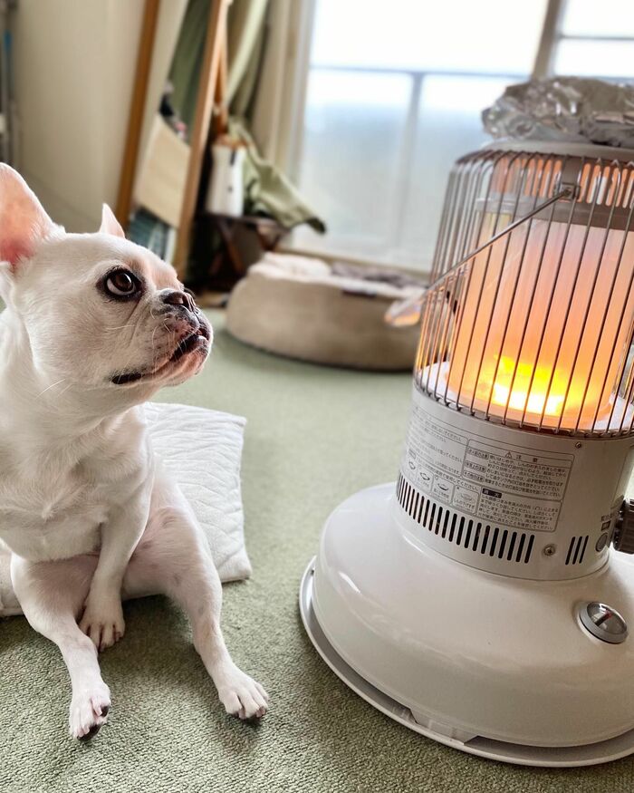 「ぶぅーーー ぬくぬくぶぅ」というコメントとともに投稿されたのは、ストーブの前で暖をとる「ヒメ」ちゃんの姿!