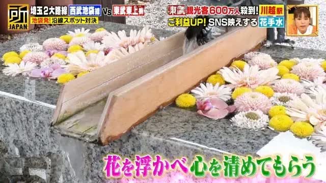 東部東上線・川越駅周辺では花手水(はなちょうず)が流行中。花手水とは、もともと神社やお寺から始まったもので、参拝の際に手や口を清めるために使う手水舎(ちょうずや)が、新型コロナウイルス感染予防の観点から使用できなくなり、代わりに花を浮かべて心を清めてもらおうというもの。
