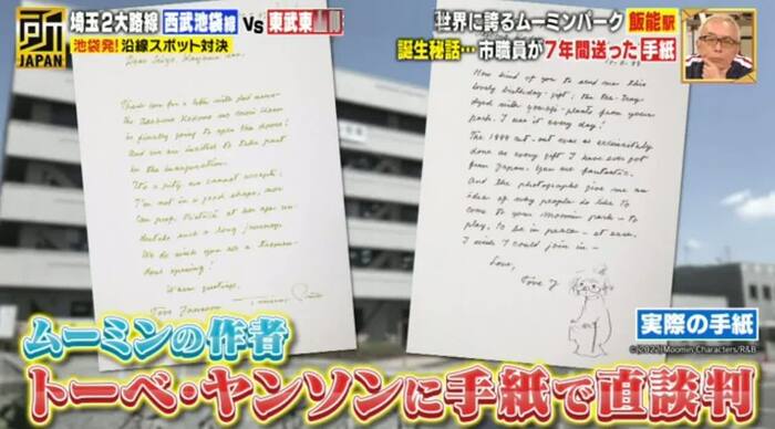 かつて市役所に勤めていた職員が、飯能の自然の豊さを生かして、子どもたちのために公園を作りたいと、自身が大好きだったムーミンの作者トーベ・ヤンソン宛てに手紙を書き直談判。