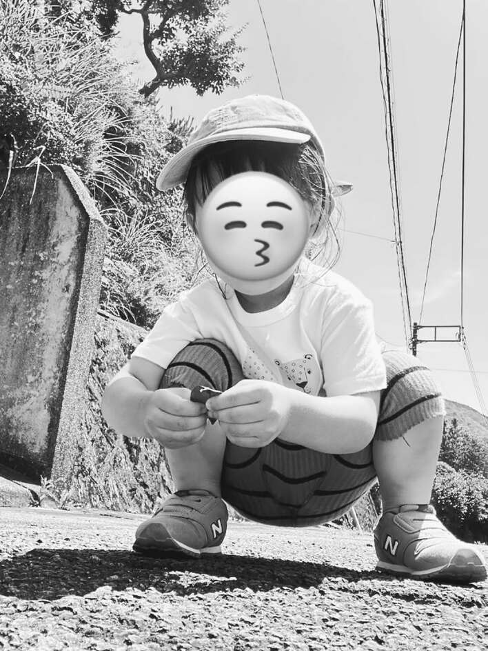 公開されたモノクロ加工がされた写真には、Tシャツにボーダーのパンツ姿でキャップをかぶった、娘の“ぷくぷく”ちゃんが、外でアスファルトの上にしゃがんでいる姿が!