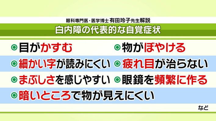 上記の症状以外にも、「『通常、眼鏡の作り変えは2年おきくらいだけれど、半年に1度作り変えたくなってしまう』『暗いところで本が読めないから自然と明るい場所に移動している』というのも、白内障のサインの一つ」と有田先生は付け加えました。