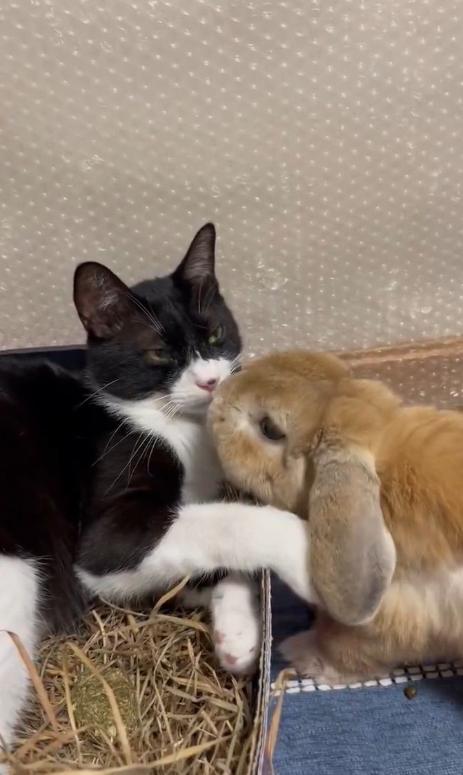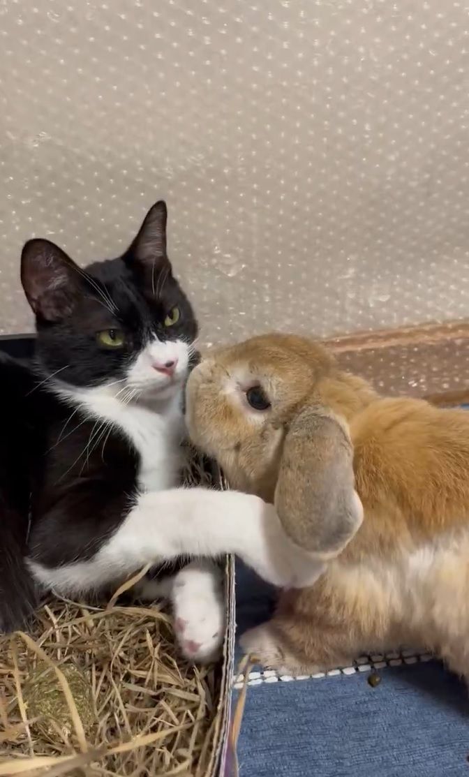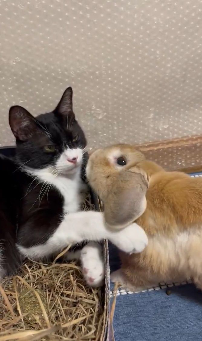 2024年11月、「可愛すぎる!」と約10万回再生(2024年11月5日時点)されるほど話題となったのがSNSに投稿された塩対応の猫と甘えん坊なうさぎの動画。