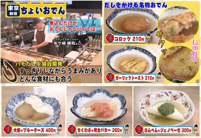 ほかにも、ちくわぶ+明太バターや、はんぺん+ジェノベーゼなんて意外な“ちょい足し”おでんや…。