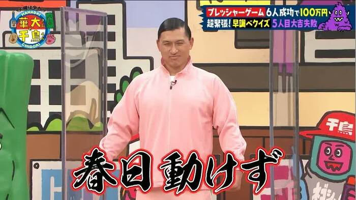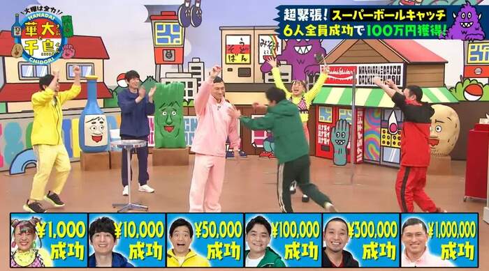 ゲストの春日俊彰(オードリー)、フワちゃんと、博多華丸・大吉、千鳥(大悟、ノブ)の6人が、1人ずつ順番にゲームに挑戦し、連続で成功すれば100万円獲得。失敗すれば獲得賞金が0円になってしまうというプレッシャーの中で、全員が成功を目指した。