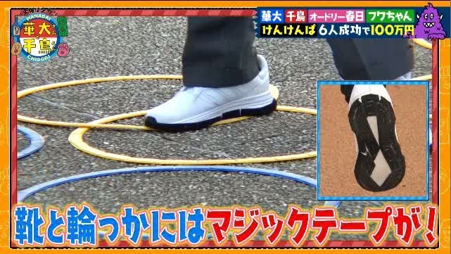 そして、ここでノブが「すごいのを発見しました!全部の足で踏むより、絶対つま先でいった方がいいわ」と提案。輪っかにかかとが当たらないようにするため、全員でその作戦でいくことに。