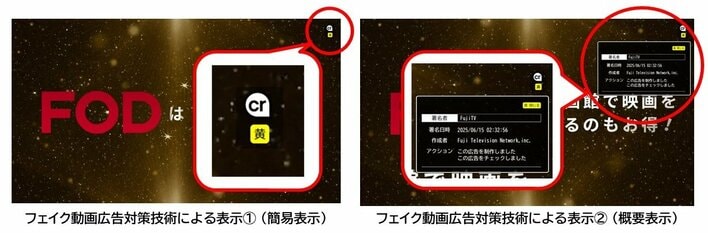 右)「フェイク広告対策技術の表示① (簡易表示)」の表示中にリモコンの黄色ボタンが押されると、暗号技術により真正性が検証された広告主情報や考査情報を表示(概要表示)