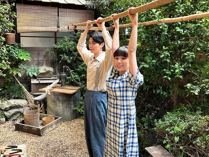 番組公式Xでは、芳根さんと本田さんが江端家の庭で物干し竿につかまる、おちゃめなオフショットが公開中。